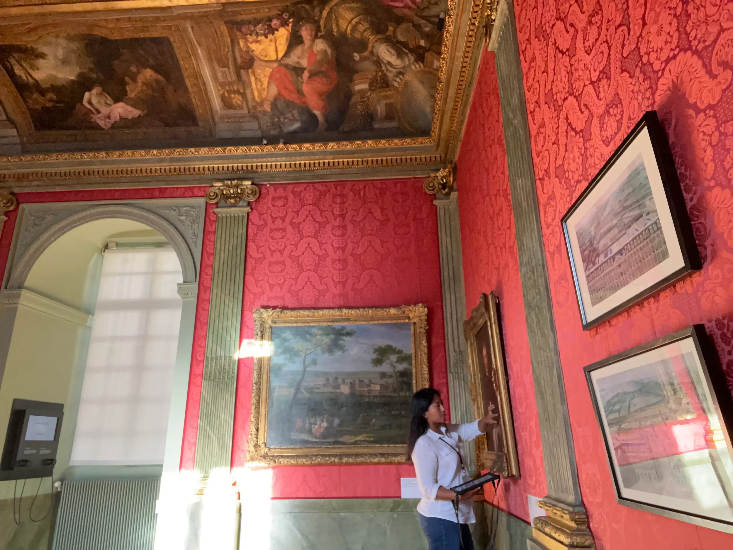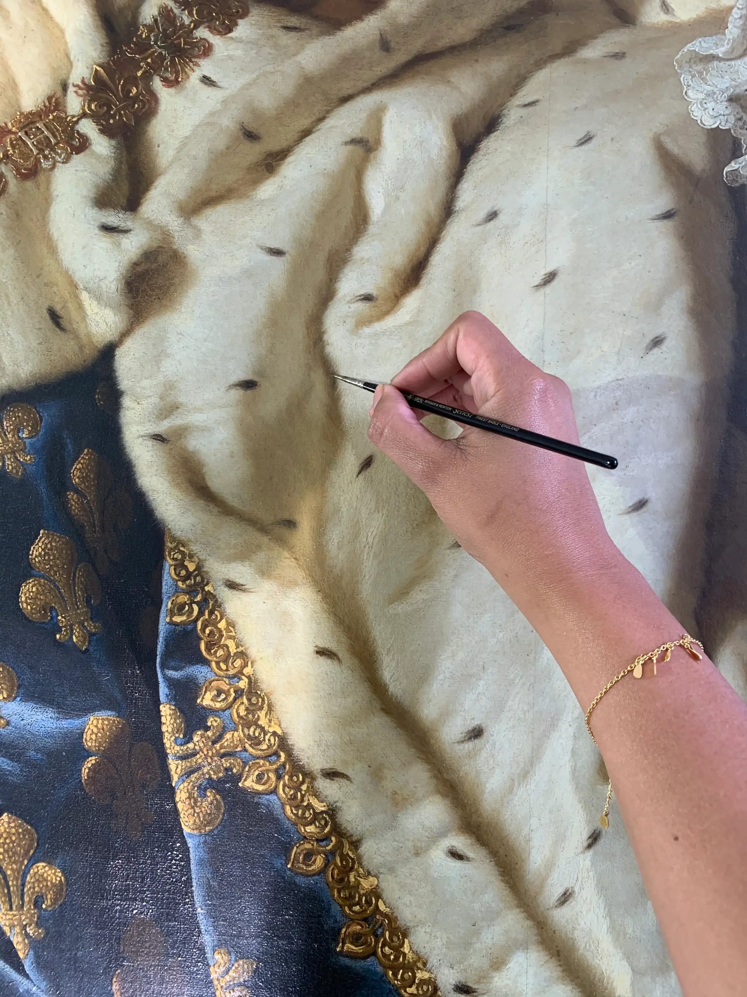le Château de Versailles dont elle assure en équipe depuis 2015 et jusqu’à fin 2027 l’entretien et le suivi de l’état de conservation des tableaux de grand format exposés dans les Grands Appartements du Roi et de la Reine,