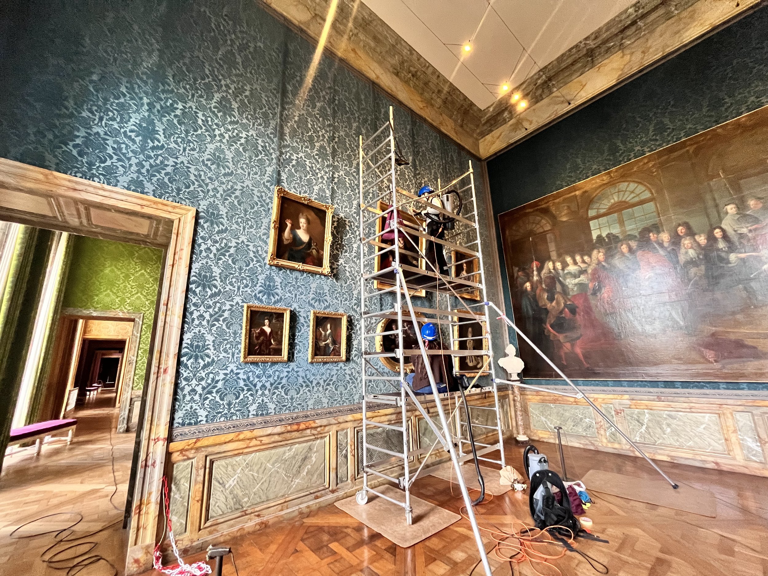 Mi-janvier nous avons réalisé sur plusieurs journées consécutives les constats d’état et le dépoussiérage des 180 tableaux environ des salles Louis XIV du Château de Versailles, spécialement fermées pour l’occasion. Ce travail se poursuivra sur d’autres séances les lundis, jours de fermeture habituelle au public.