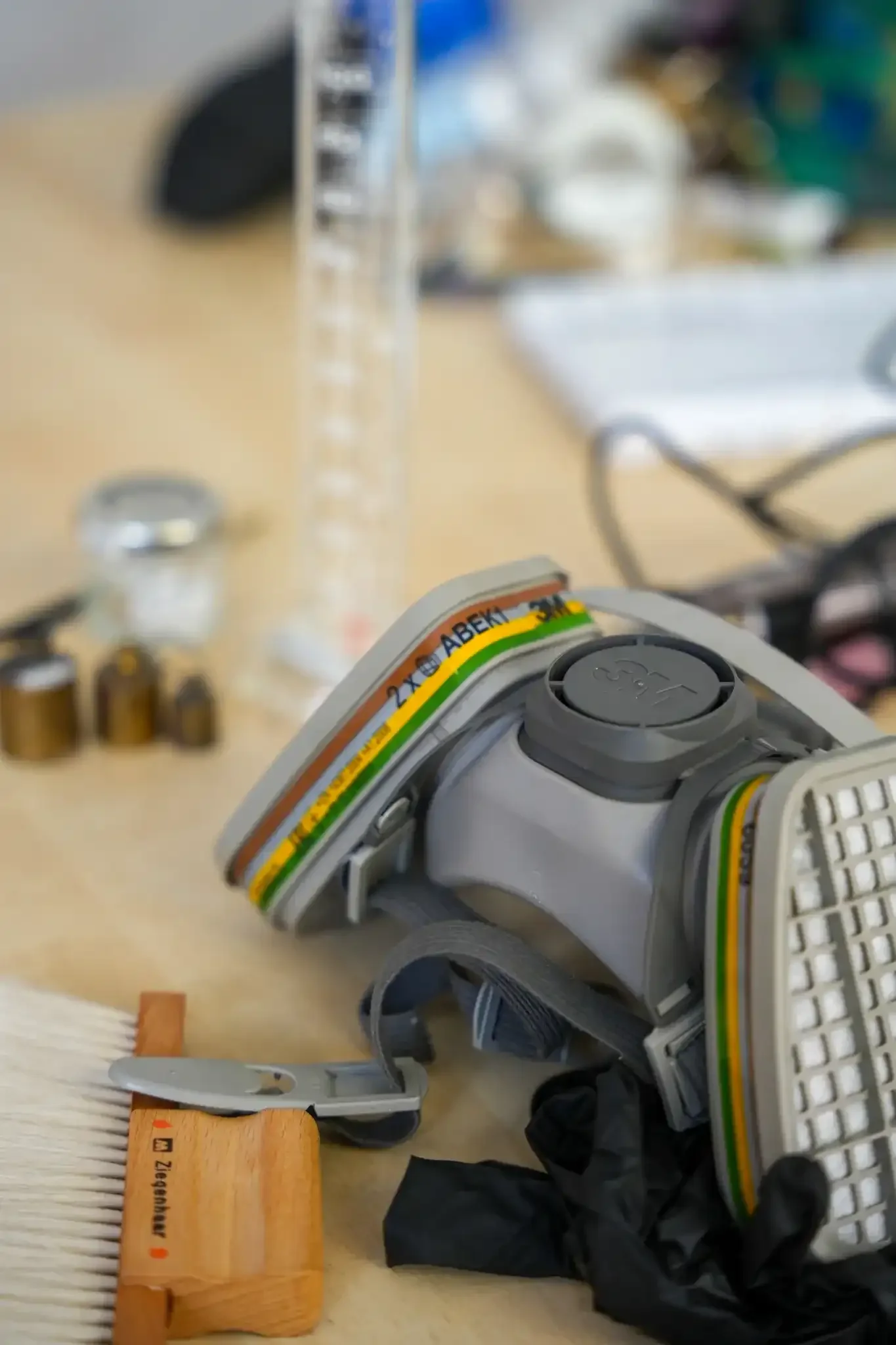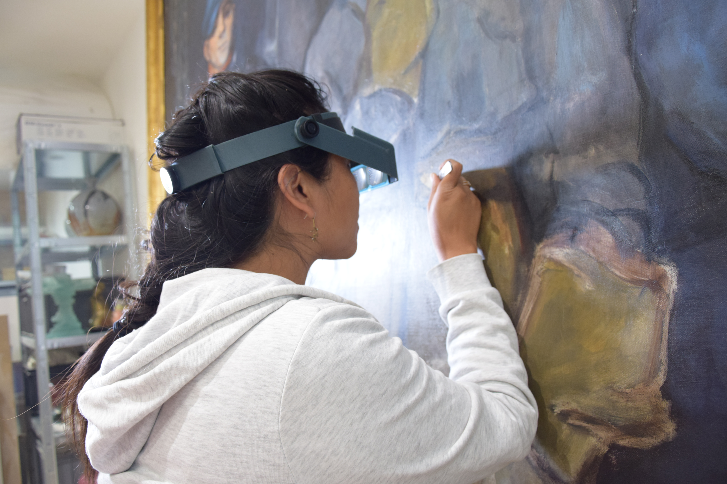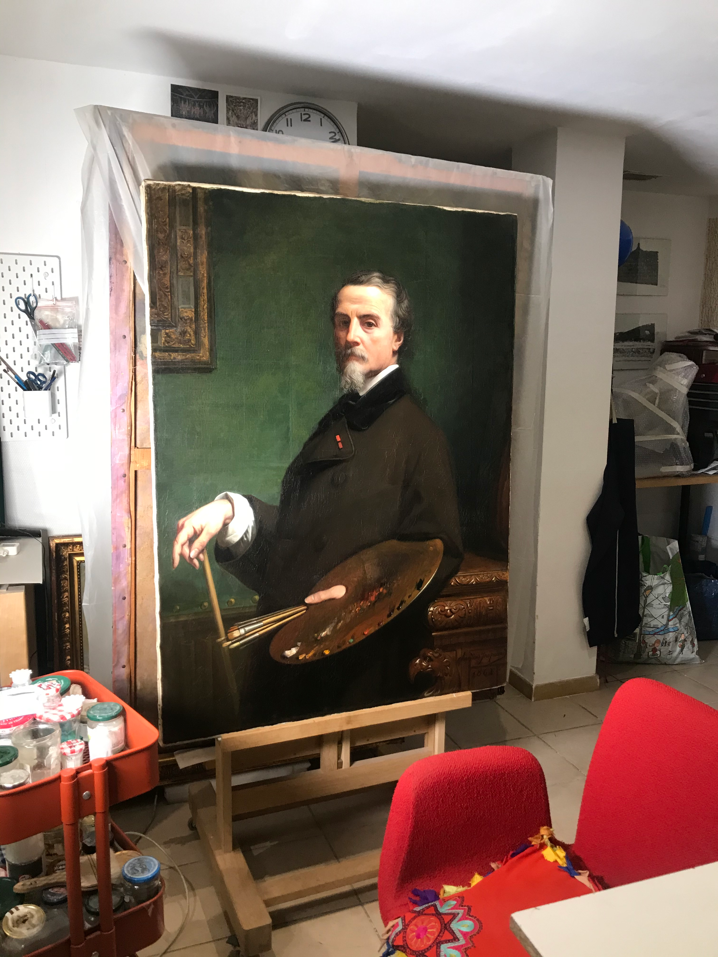 L’atelier dispose d’une surface d’environ 100m2, avec une réserve indépendante à l’atmosphère contrôlée. L’espace dédié au traitement des peintures est adapté et outillé pour examiner et intervenir sur les supports toile et bois des œuvres ainsi que sur leur couche picturale.